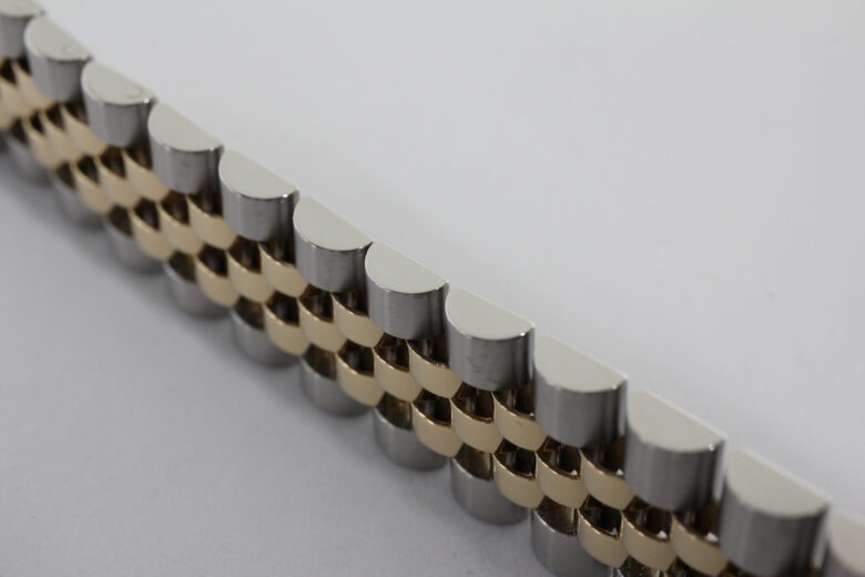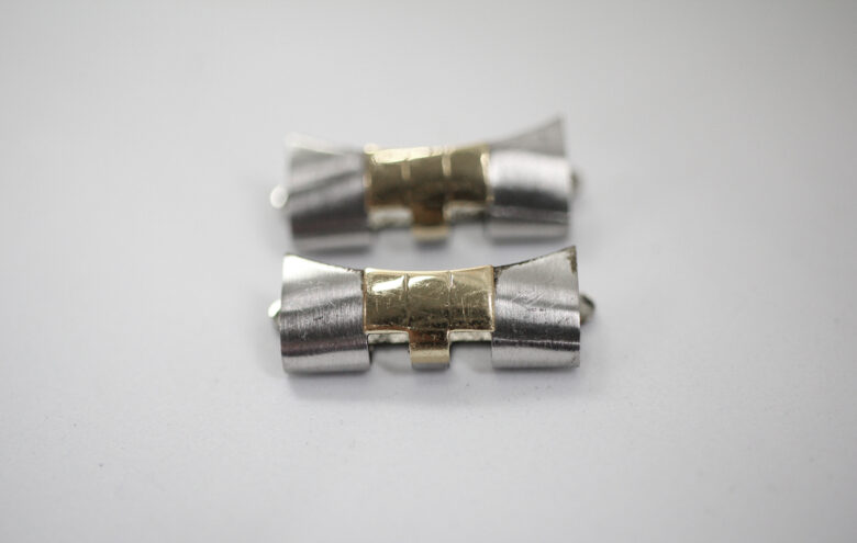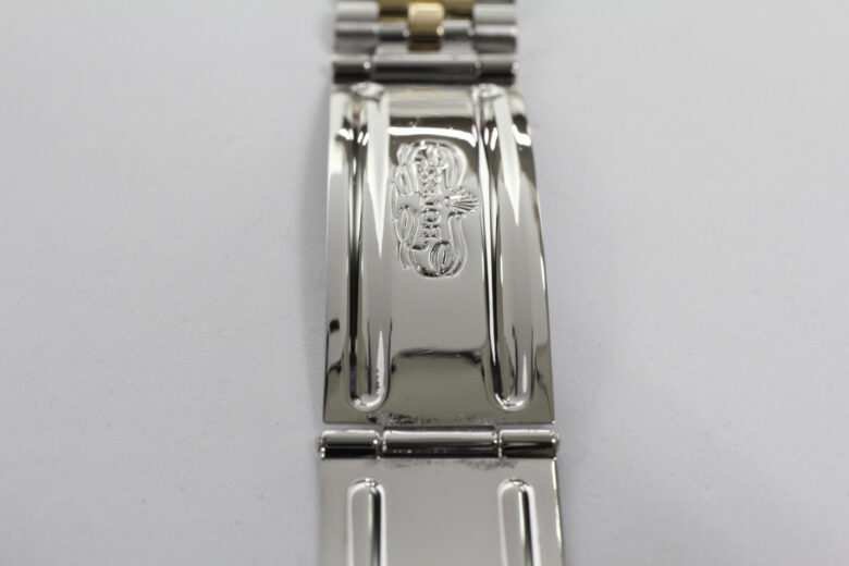 本体、ベルトなどの各パーツの面に合わせて小型のリューター、バフ機、ザラツ研磨機を使い、それぞれの角度から丁寧に磨きます。傷や打痕の凹凸した面からシャープなエッジ、面、光沢が蘇ります。